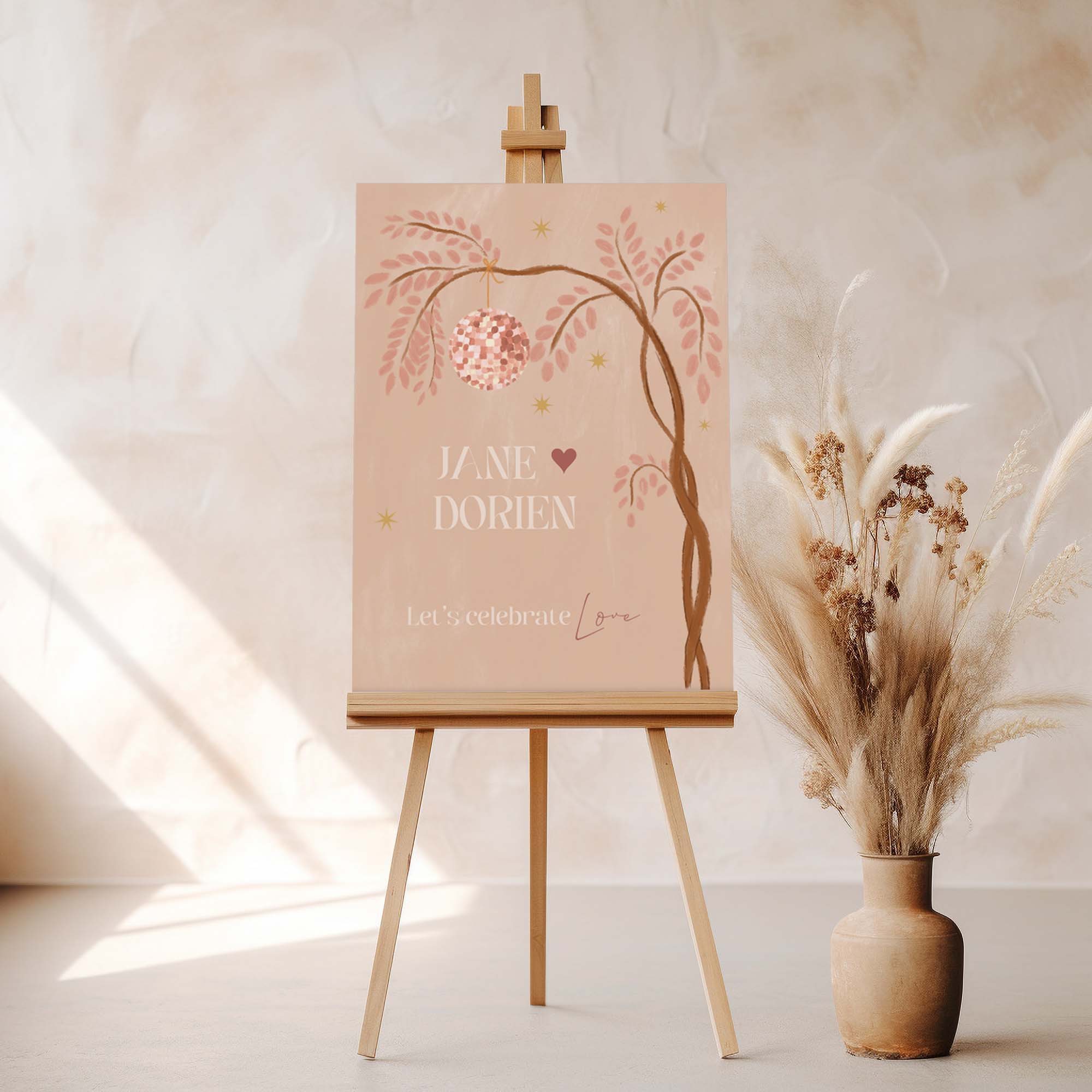 Passend bij de dansende zon en maand vind je dit welkomstbord. Het feest kan beginnen met de discobal in de boom op dit bruiloftsbord.