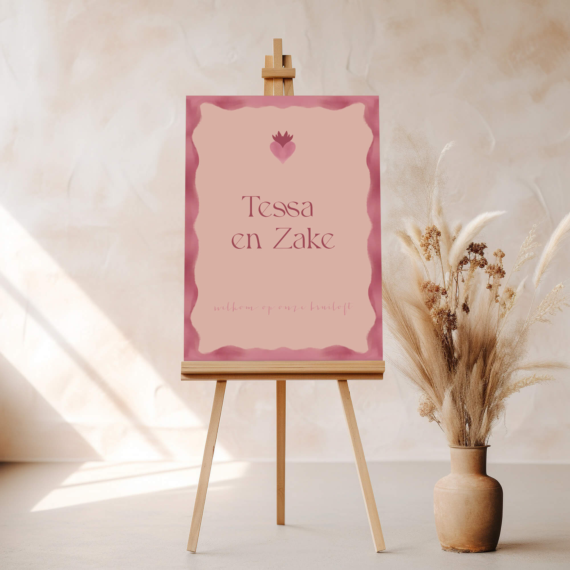 Passend bij de collectie met de leeuwen vaas. Een bruiloftbord om jouw gasten welkom te heten op jullie bruiloft.