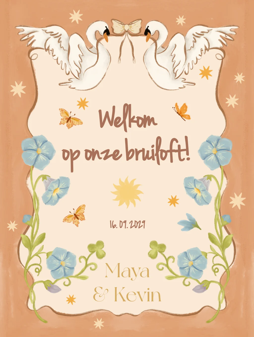 Een welkomstbord passend bij de collectie de met sierlijke zwanen en palmbomen. Heet jouw gasten op een passende manier welkom op jullie bruiloft.