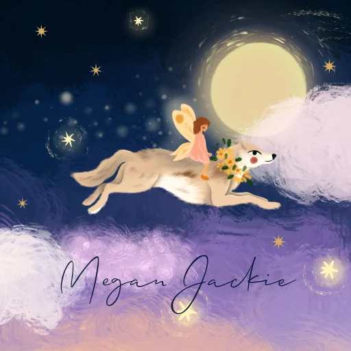 Het elfje en de wolf in een dromerige omgeving. Genderneutraal en daarmee geschikt voor een jongen en een meisje.