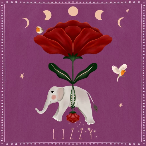 De olifant zweeft door de lucht aan een luchtballon gemaakt van bloemen.