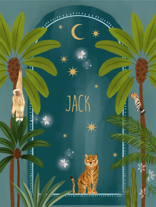 De tijger wordt omring door palmbomen. In de ene boom hangt een aapje en in de ander een tropische vogel.