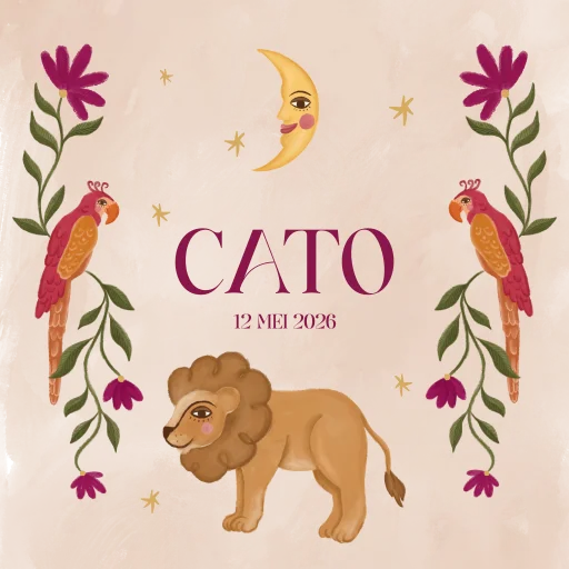 Een schattige leeuw omringd door bloemen en kleurrijke papegaaien.