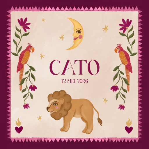 Een schattige leeuw omringd door bloemen en kleurrijke papegaaien.