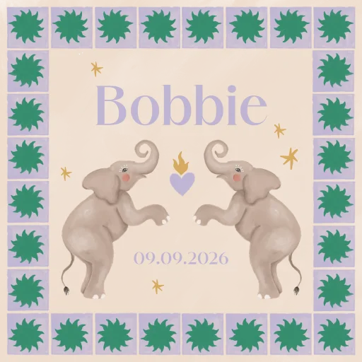 Een symmetrisch ontwerp met olifanten in lila met groen en beige.