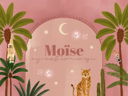 Bewaar de mooiste herinneringen uit de kraamtijd in deze roze jungle memorybox.