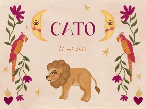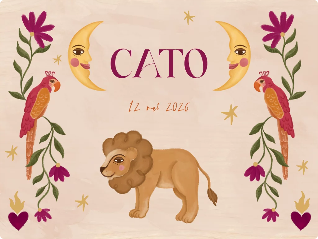 Bewaar de mooiste herinneringen uit de kraamtijd in deze memorybox met leeuw en roze papegaaien.