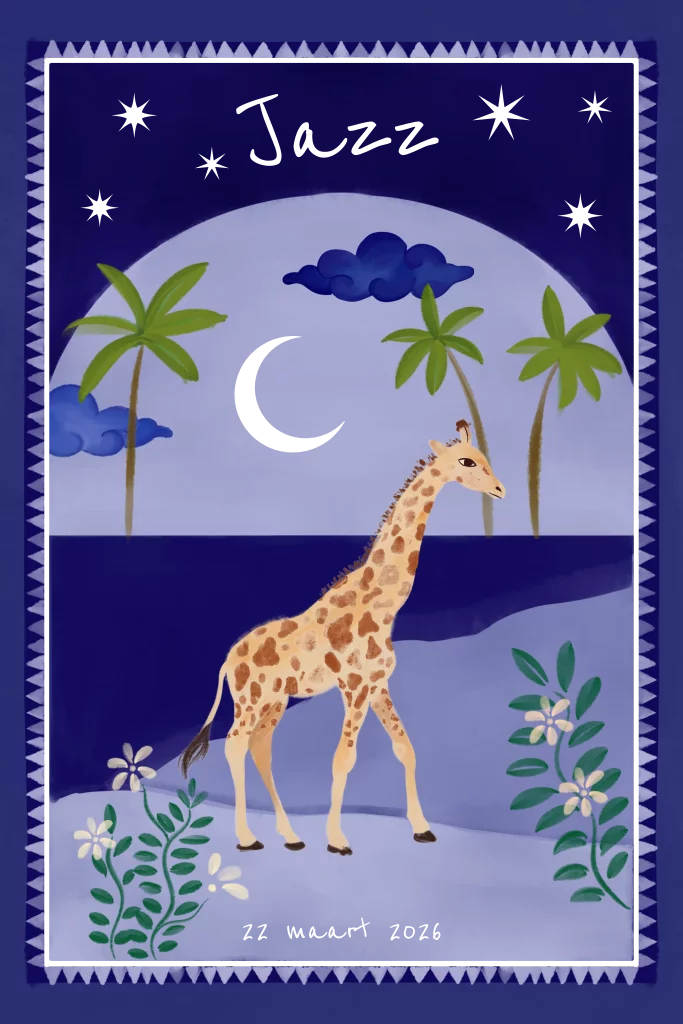 In giraffe in zijn natuurlijke leefomgeving. In de woestijn wordt hij omringd palmbomen.