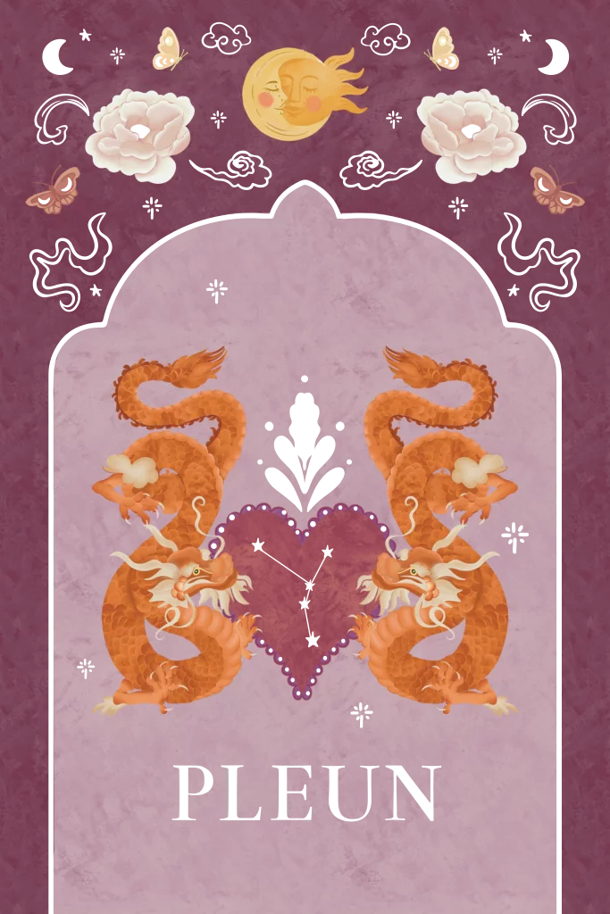 Fantasierijke poster met Japanse draken. Het sterrenbeeld in het hart kun je weglaten of aanpassen aan de geboortedatum van jouw kleine wonder.