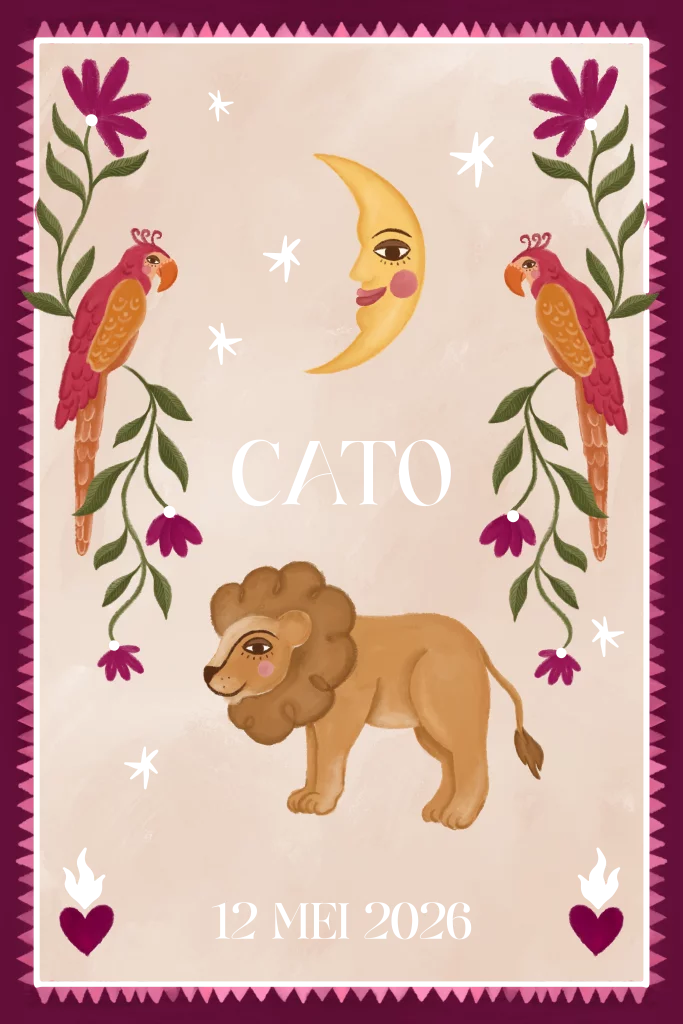 Een schattige leeuw omringd door bloemen en kleurrijke papegaaien.