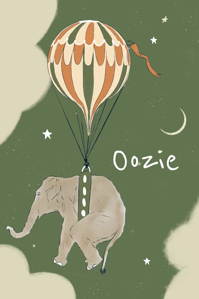 Een fantasierijke poster met een vliegende olifant aan een luchtballon. De kleuren kun je naar wens aanpassen.