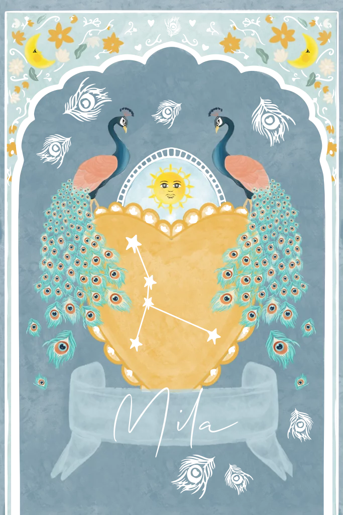 Zo trots als een pauw! Het sterrenbeeld kun je weglaten of aanpassen aan de geboortedatum.
