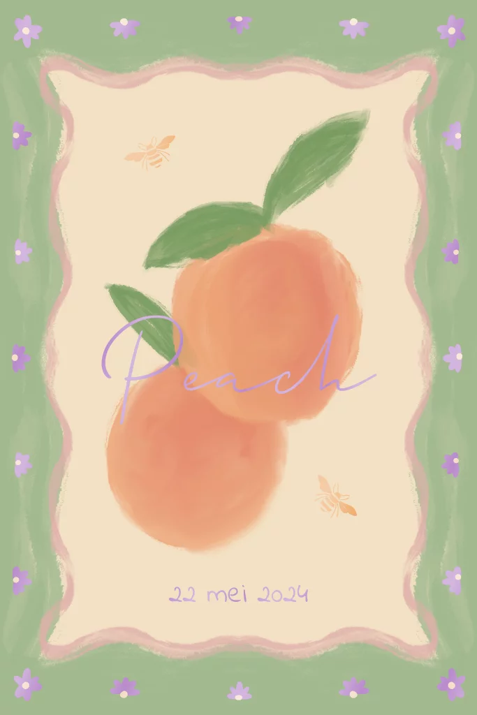 Een fris en fruitige poster met de zomerse perzik en lila bloemen.
