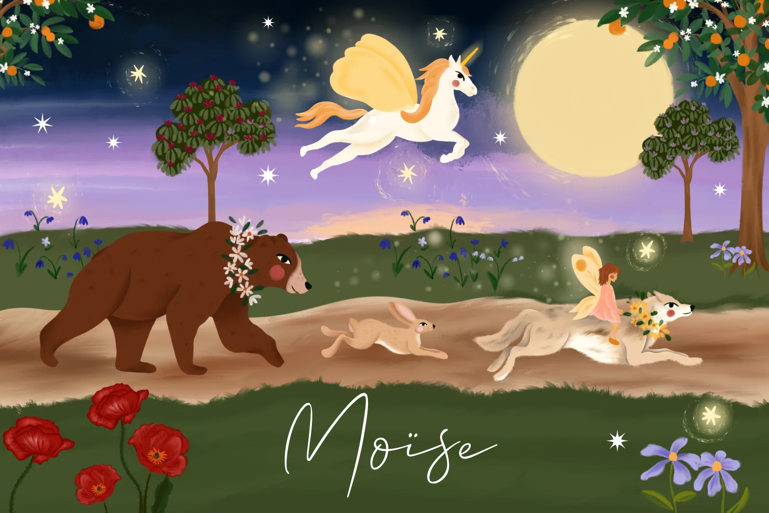 Het sprookjesbos, een heerlijk fantasierijke poster. Een beer, konijn, unicorn en wolf met daarop een elfje in een bosrijke omgeving. Genderneutraal en daarmee geschikt voor de kamer van een jongen en een meisje.