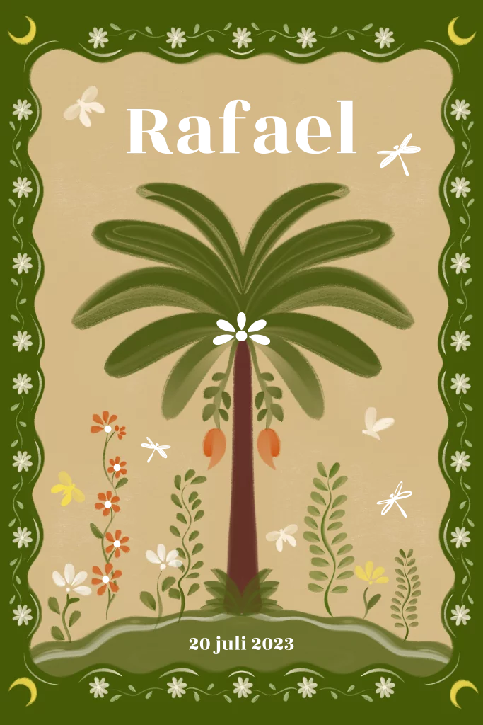 Een kaartje vol bloemen, vlinders en libellen rondom een palmboom.