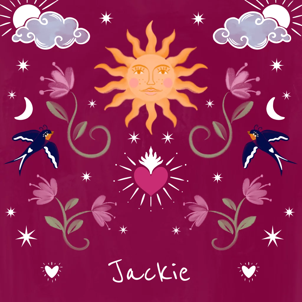Een symmetrische poster met zwaluwen, bloemen en de zon.