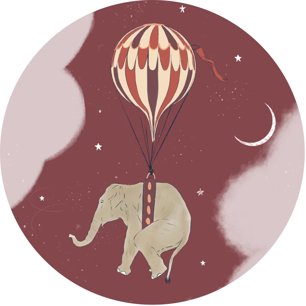 Een fantasierijke behangcirkel met een vliegende olifant aan een luchtballon. De kleuren kun je naar wens aanpassen.