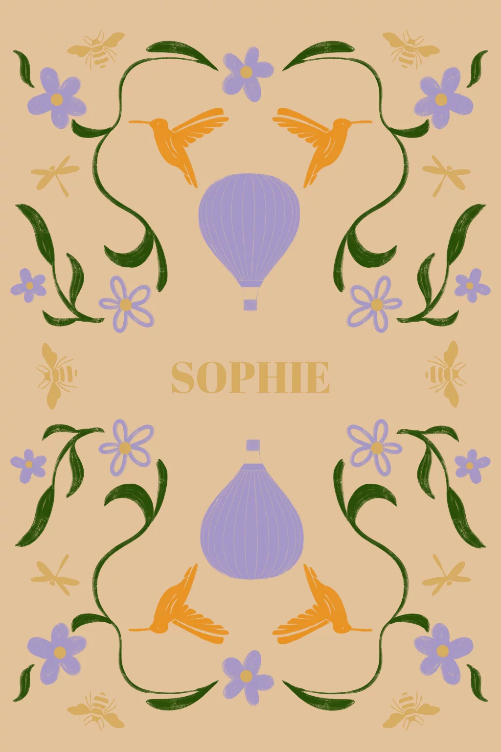 Een tuinbord van het symmetrische geboortekaartje met luchtballonen en kolibrie.