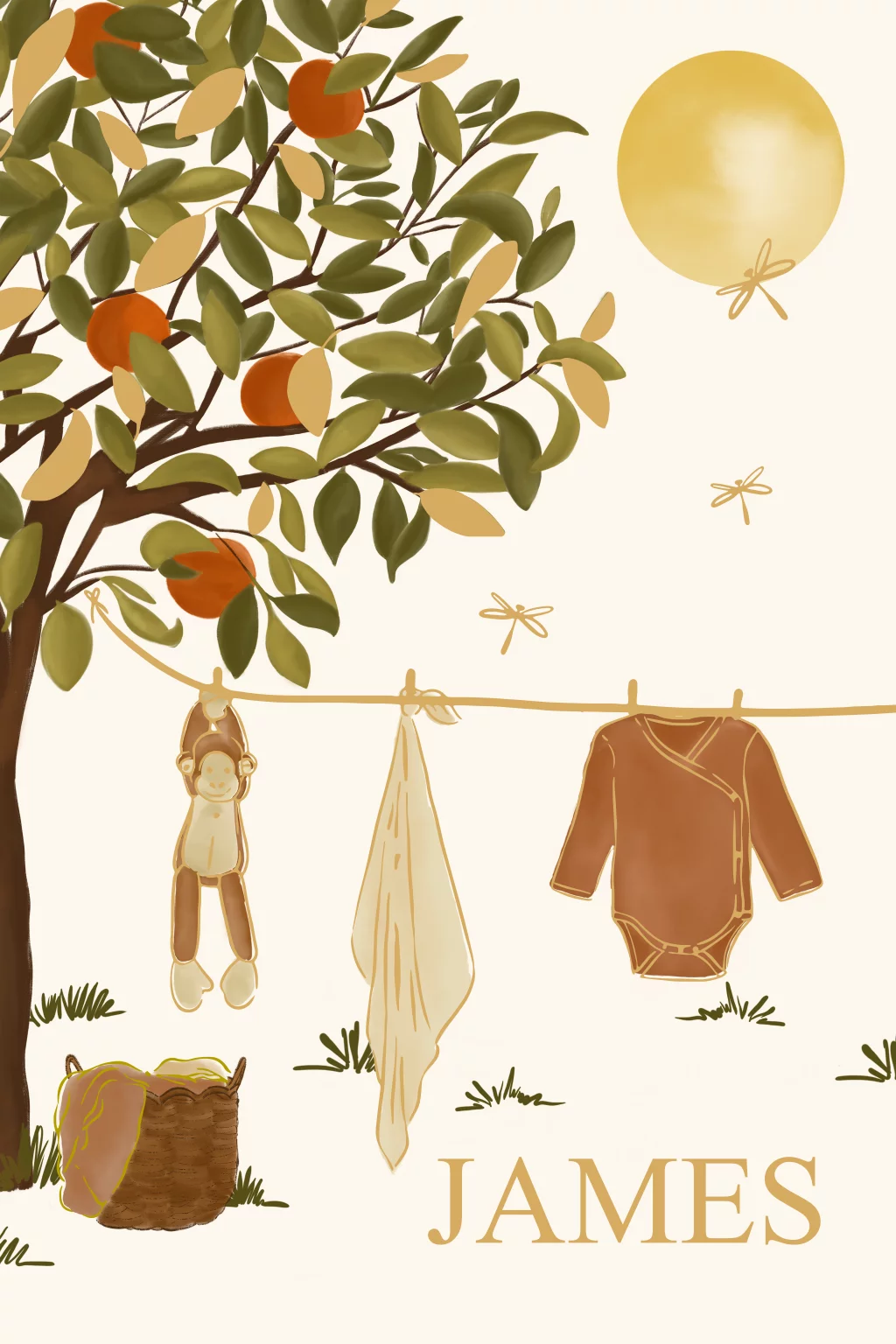 Een frisse sinaasappelboom waar je eerste wasje voor de kleine al aan hangt.
