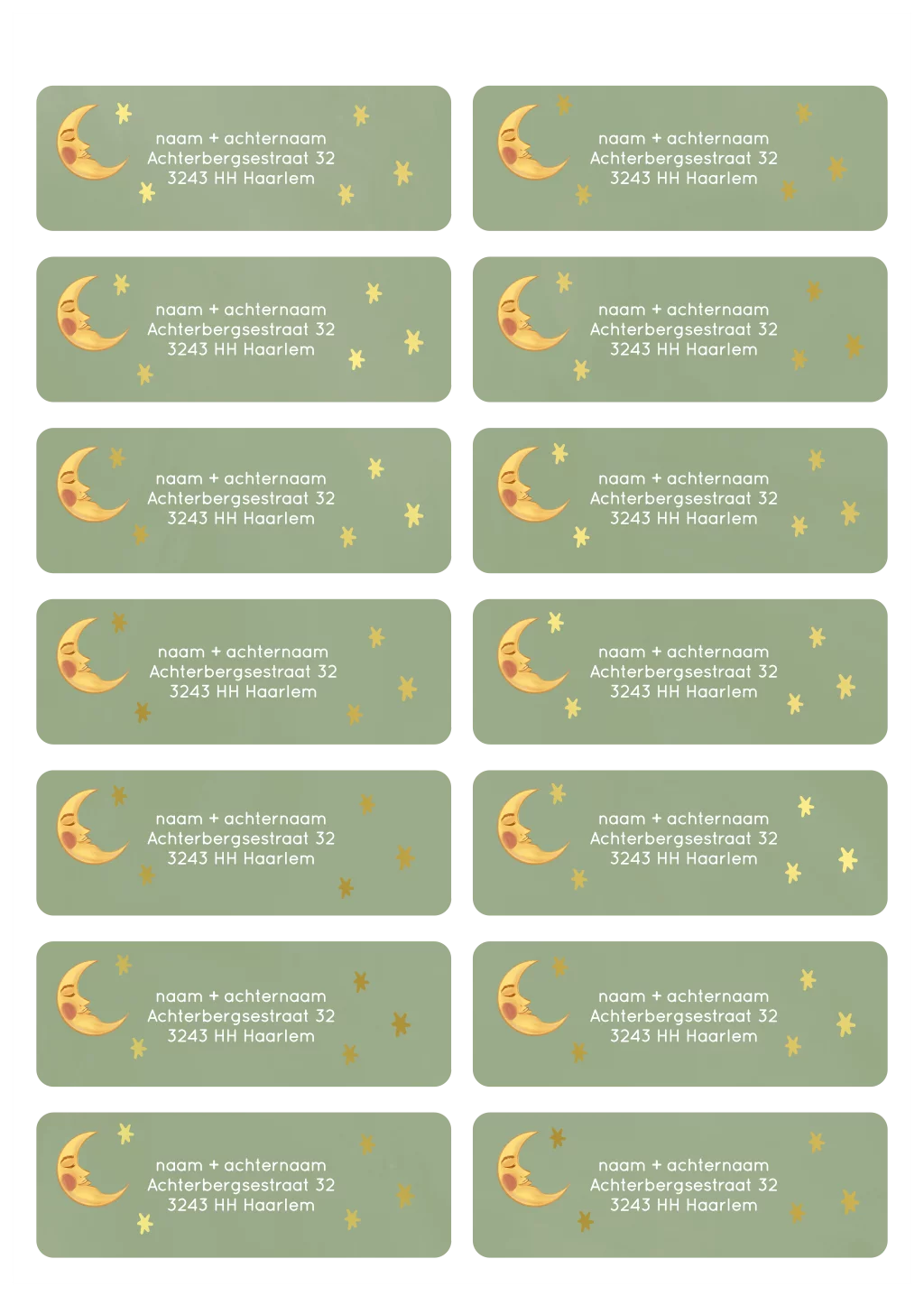Adresstickers met de maand en gouden sterren op een groene achtergrond.