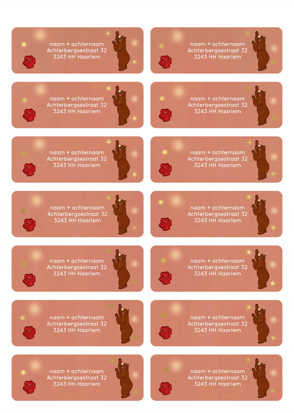 Adresstickers met de beer, gouden sterren en een roos op een roze achtergrond.