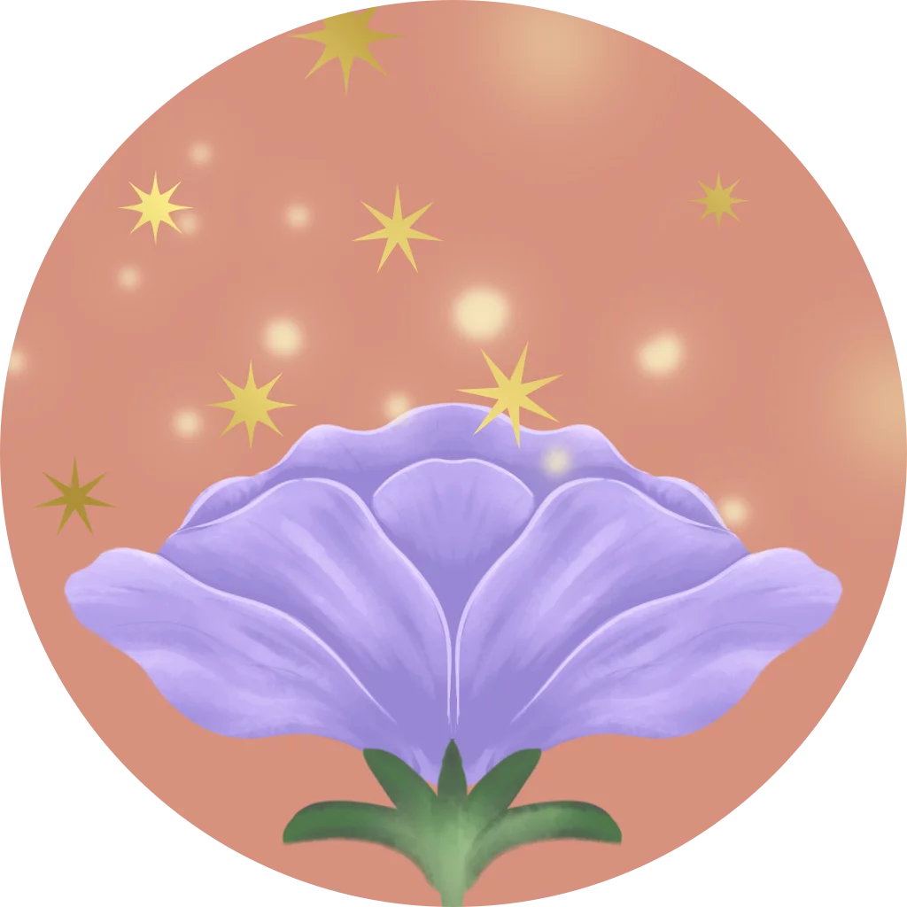 Een sluitzegel met een lila bloem en sterren in folie.