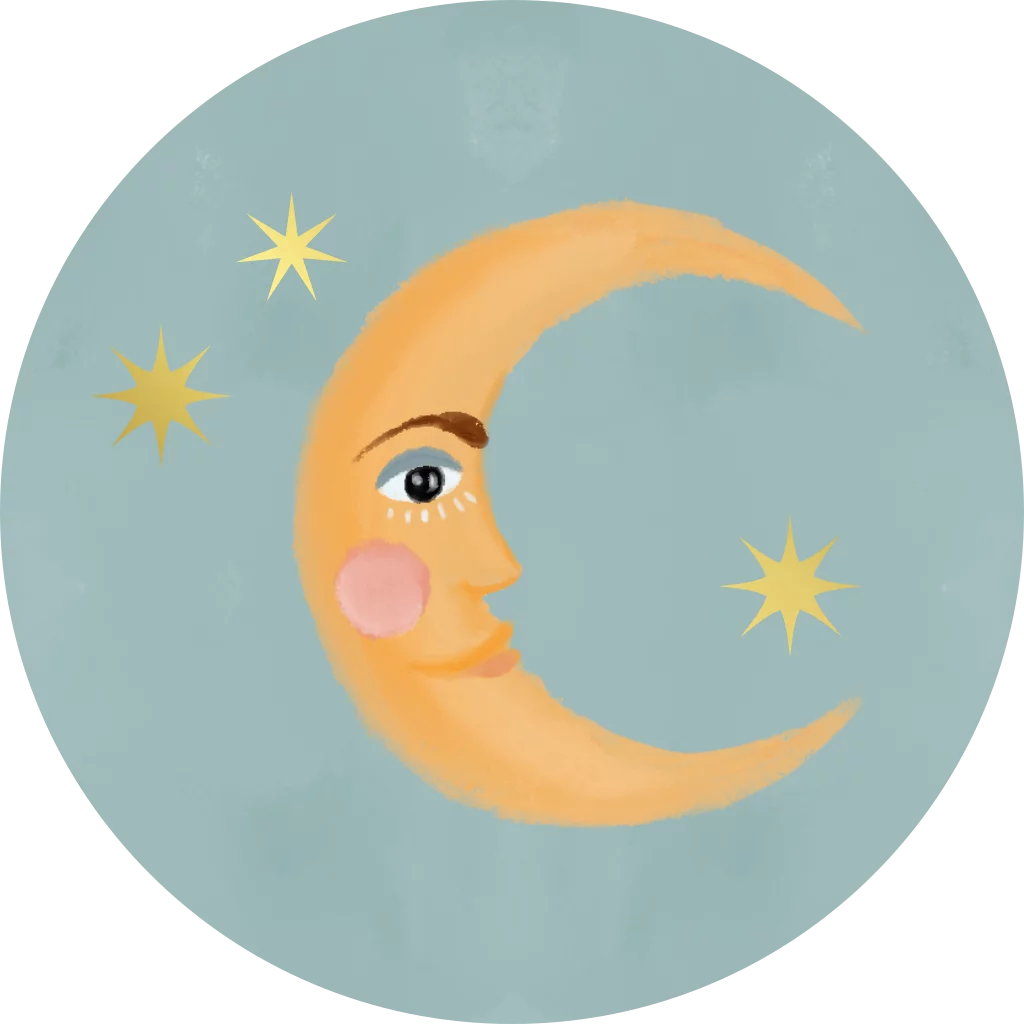 Een blauwe sluitsticker met een maan passend bij het geboortekaartje met de labradoodle.