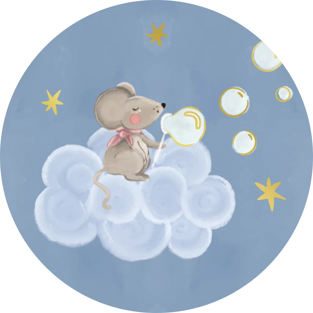 Een blauwe sluitsticker met een schattig muisje die bellen blaast.