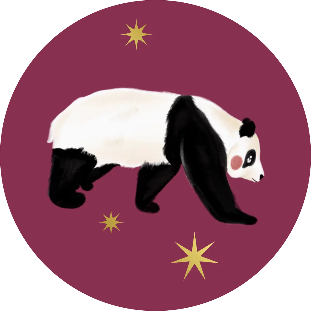 Sluitzegel met de panda en gouden sterren op een paarse achtergrond.