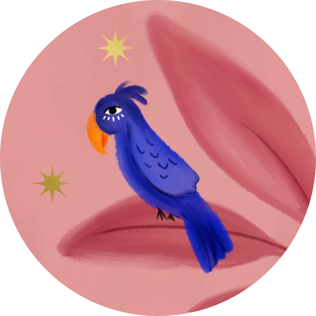 Sluitzegel met een blauwe papegaai op een roze achtergrond met gouden sterren.