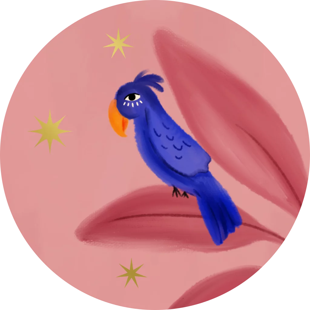Sluitzegel met een blauwe papegaai op een plant en gouden sterren.