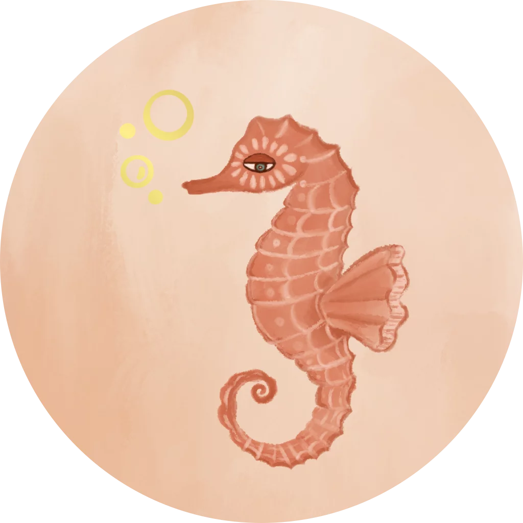 Sluitzegel met een roze zeepaardje en gouden luchtbelletjes
