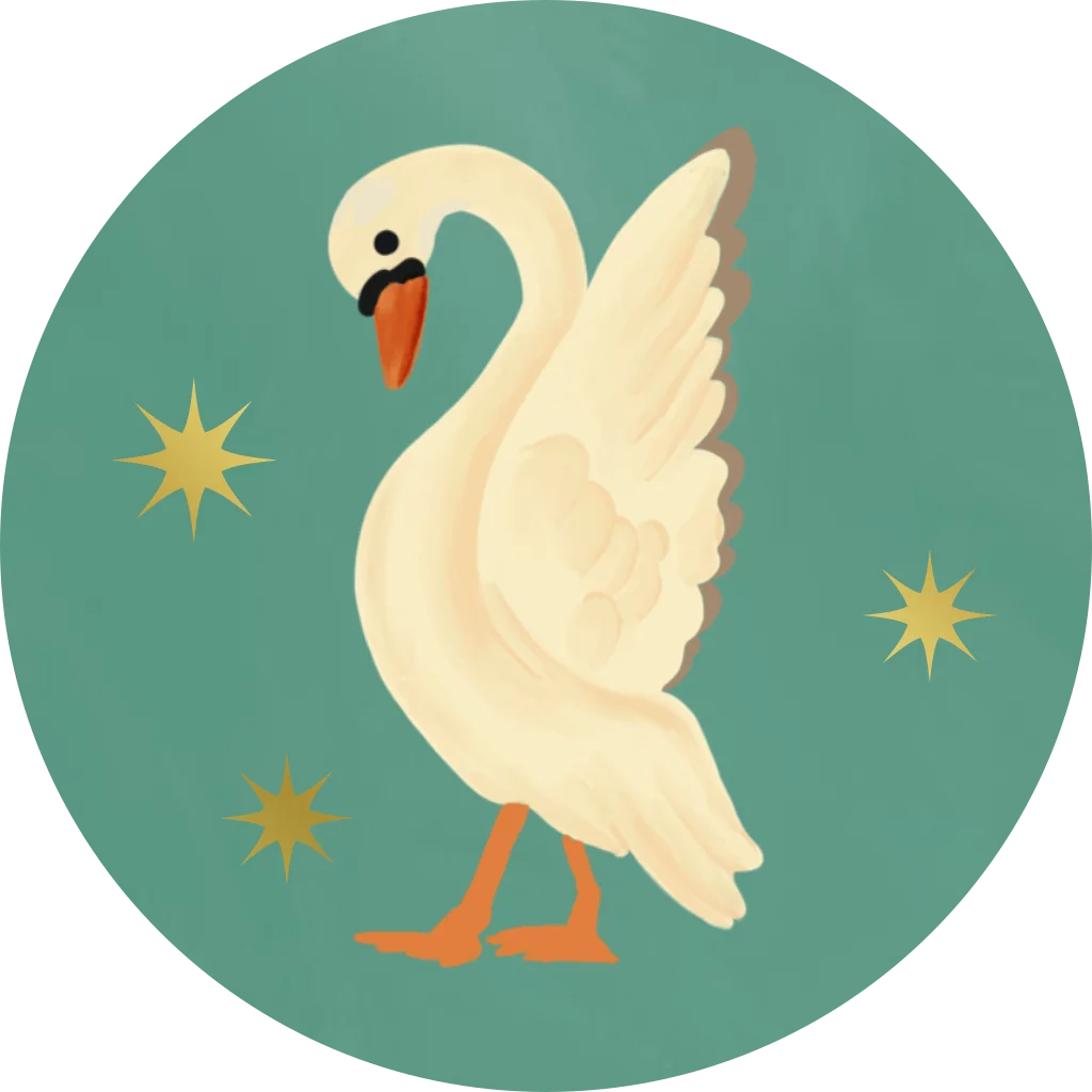 Een sluitzegel met een zwaan en sterren in folie op een aqua blauwe achtergrond.