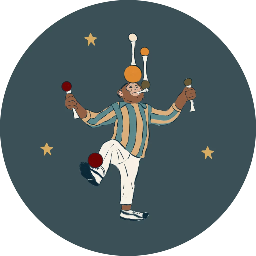 Sluitzegel met jonglerende aap en petrol achtergrond.