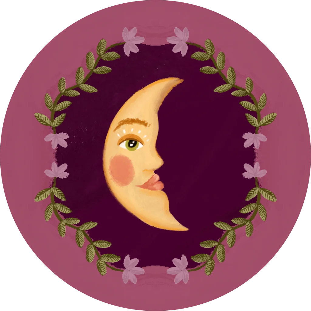 Een paars roze sluitsticker met een maan omringd door bloemen.