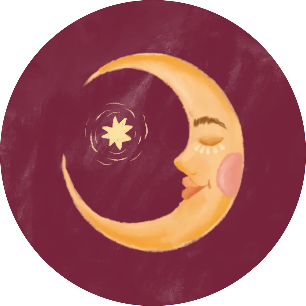 Een slapende maan met een schijnende ster op een rode achtergrond.
