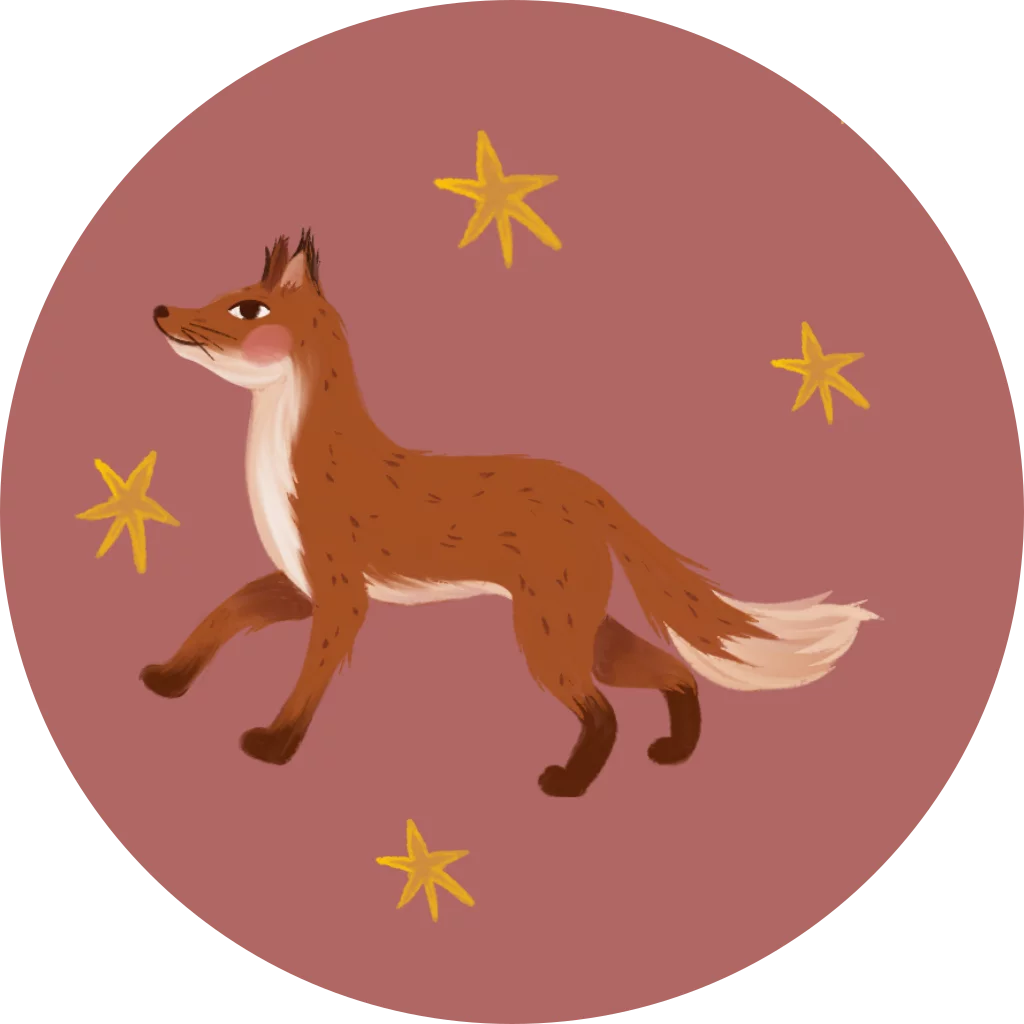 Sluitzegel met een vos en sterren op een roze achtergrond.
