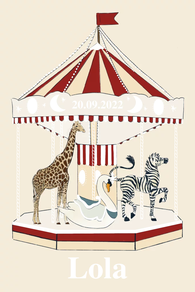 De carrousel met dieren is beschikbaar in verschillende kleurvarianten. Dit maakt het kaartje geschikt voor jongens en meisjes. Je kunt er ook voor kiezen om zelf de kleuren aan te passen.