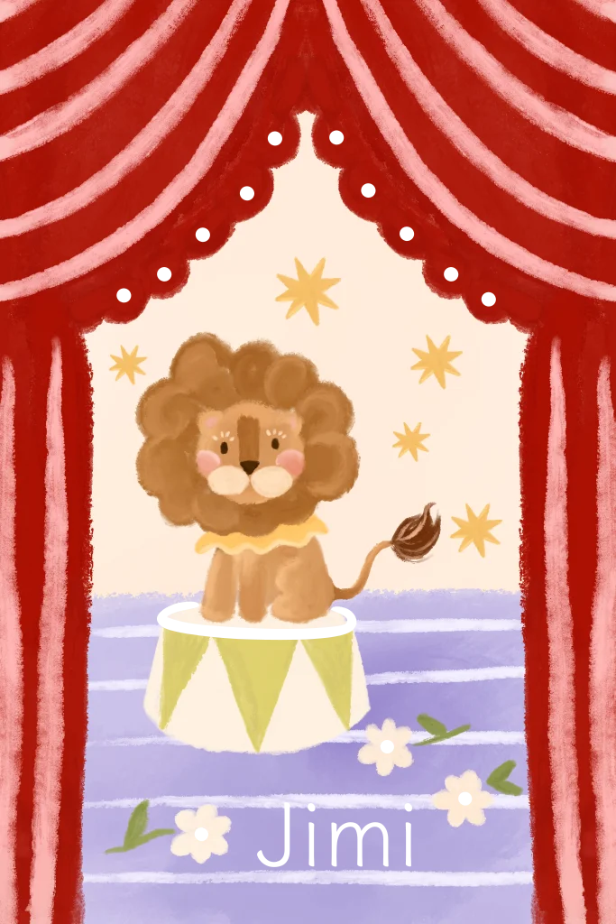 Door de gordijnen zie je op het podium dit schattige leeuwtje. Op de achterkant een leuk olifantje.