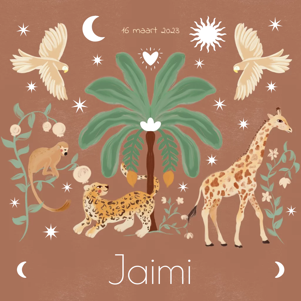 Een vierkant geboortekaartje met een jungle thema. Het geboortekaartje is ook verkrijgbaar in andere kleuren en vormen.