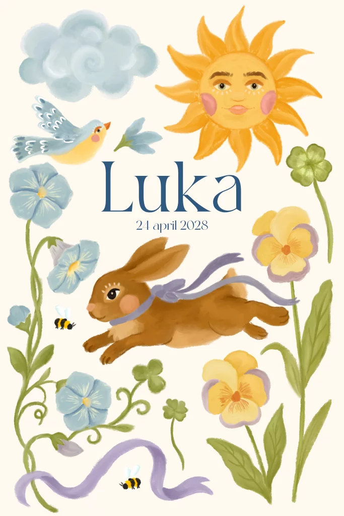Een geboortekaartje waarbij het gevoel van de lente helemaal naar boven komt. Een schattige konijntje omringd door bloemen, bijtjes en vogels.