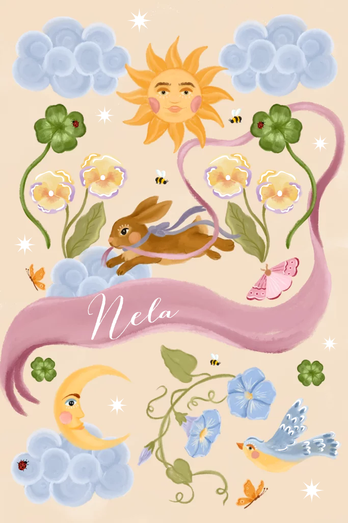 Een geboortekaartje waarbij het gevoel van de lente helemaal naar boven komt. Een schattige konijntje omringd door bloemen, bijtjes en vogels.