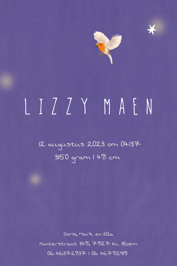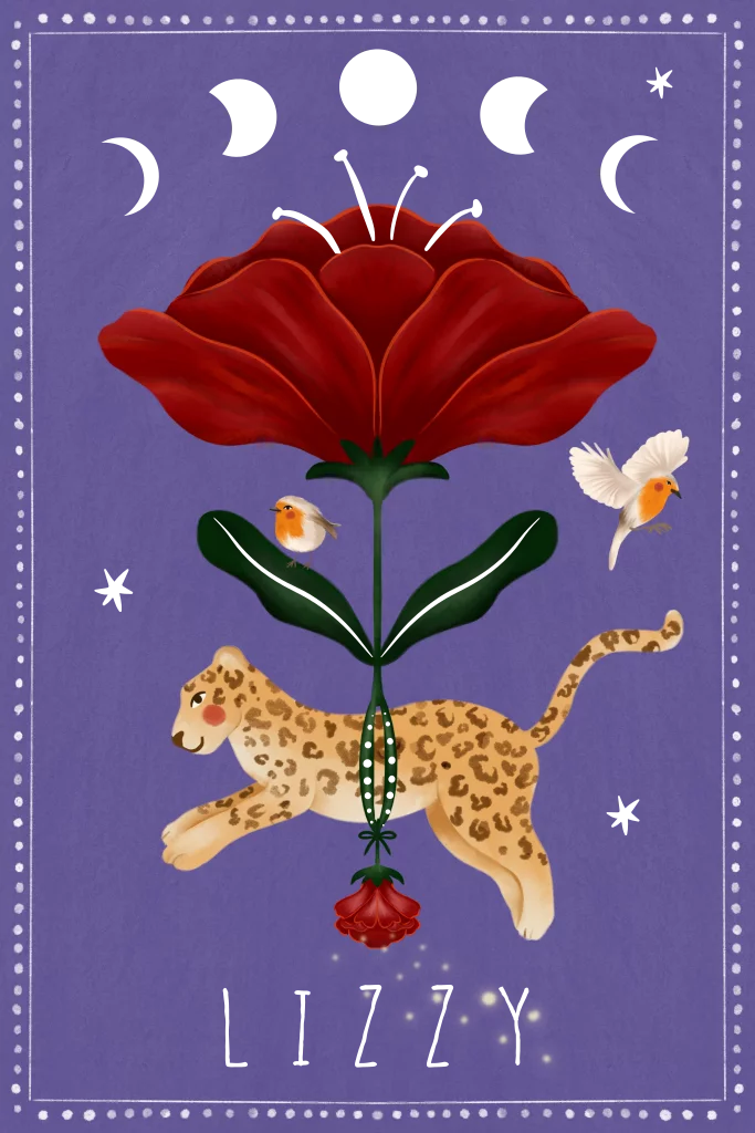 Een gevouwen geboortekaartje met een panter in de kleuren paars en rood. De panter zweeft door de lucht aan een luchtballon gemaakt van bloemen. Het kaartje wordt afgemaakt met schattige vogeltjes en de verschillende maanstanden. Je kunt zelf ook de folie kleur aanpassen.