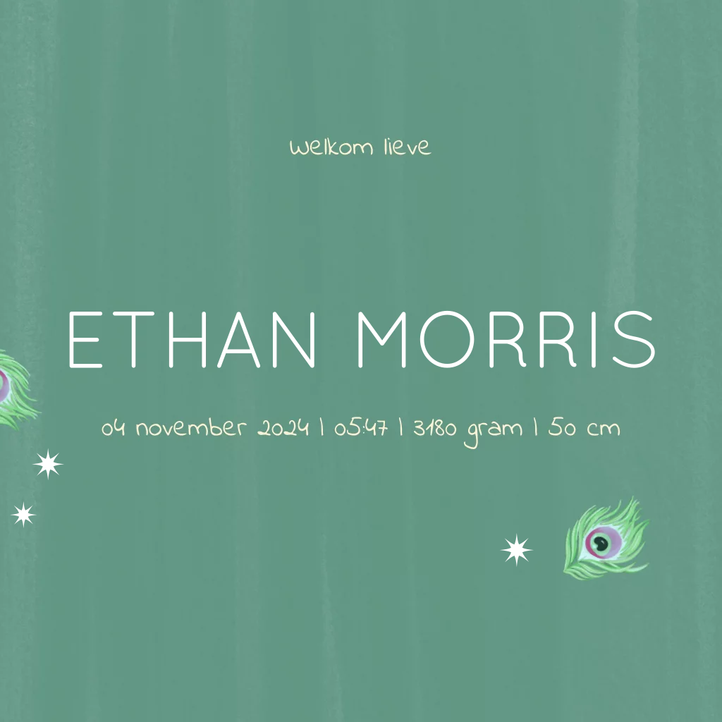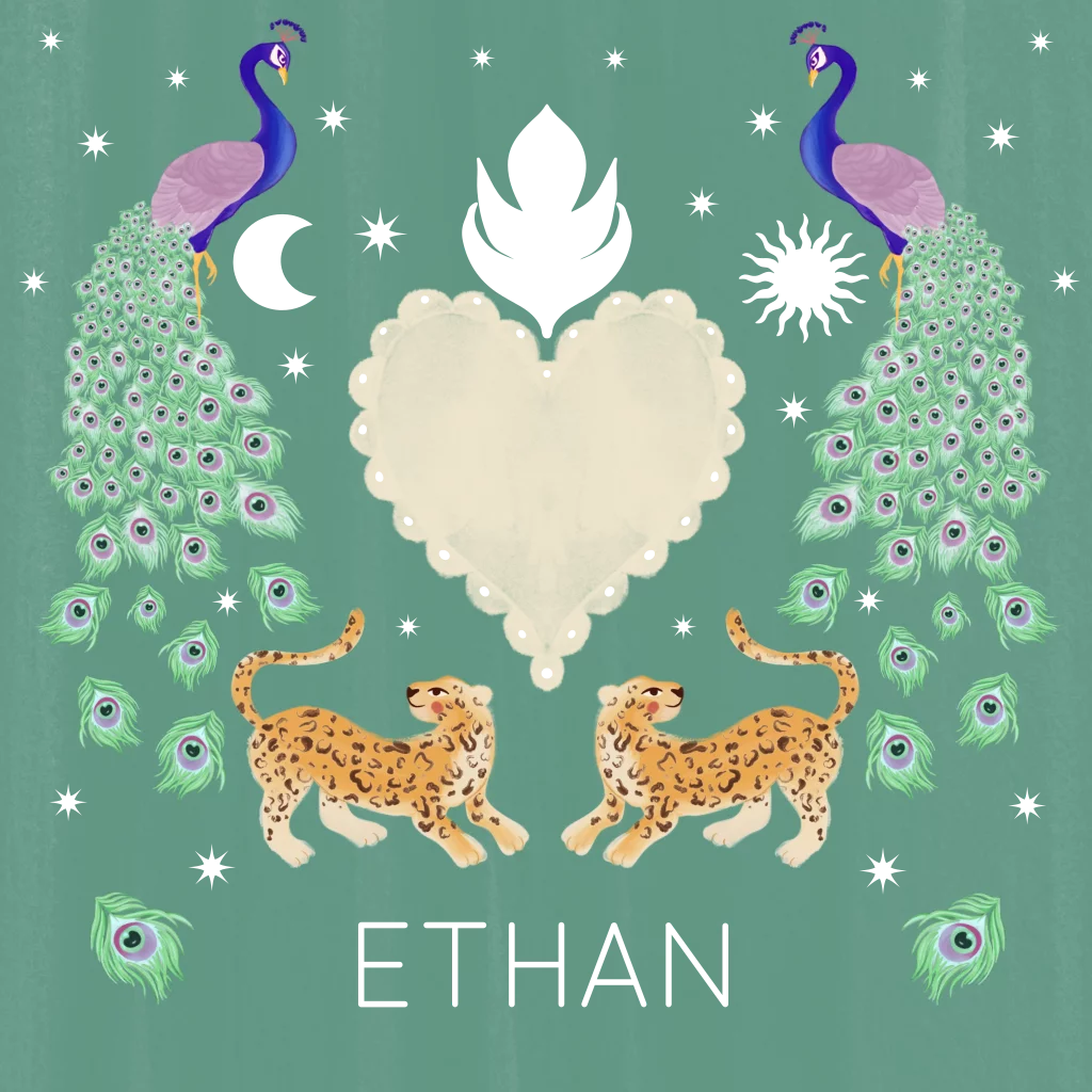 Een vierkant geboortekaartje met pauwen en panters. Je kunt ervoor kiezen om het sterrenbeeld toe te voegen in het hart.