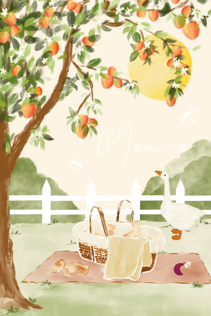 Naast het kaartje met de sinaasappelboom is ook dit geboortekaartje met de perzikboom beschikbaar. Een speels picknick tafereel waarbij het kindje in de mozesmand vergezeld wordt door een gansje. Deze variant is uitgevoerd met hekje, maar er is ook een beige variant waarbij geen hekje is afgebeeld. De kleuren kunnen naar wens worden aangepast.