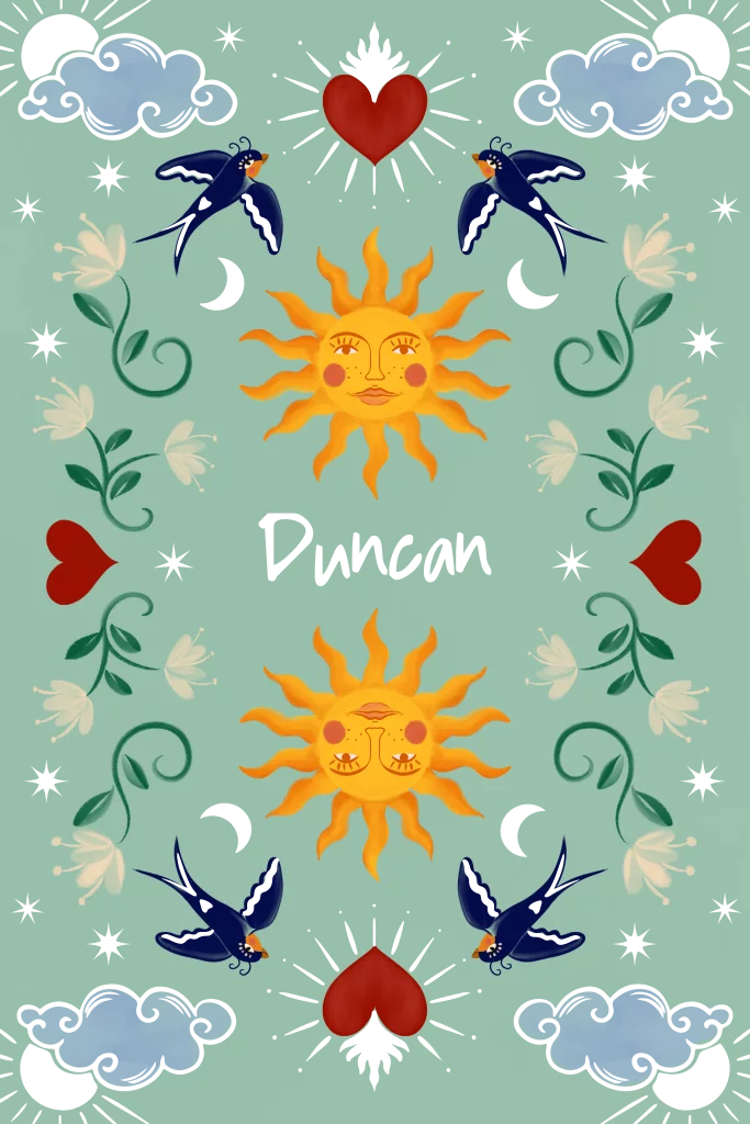 Een symmetrisch geboortekaartje met zwaluwen, bloemen en de zon. Het kaartje is ook beschikbaar in andere kleurvarianten. Ook verkrijgbaar als vierkant kaartje.