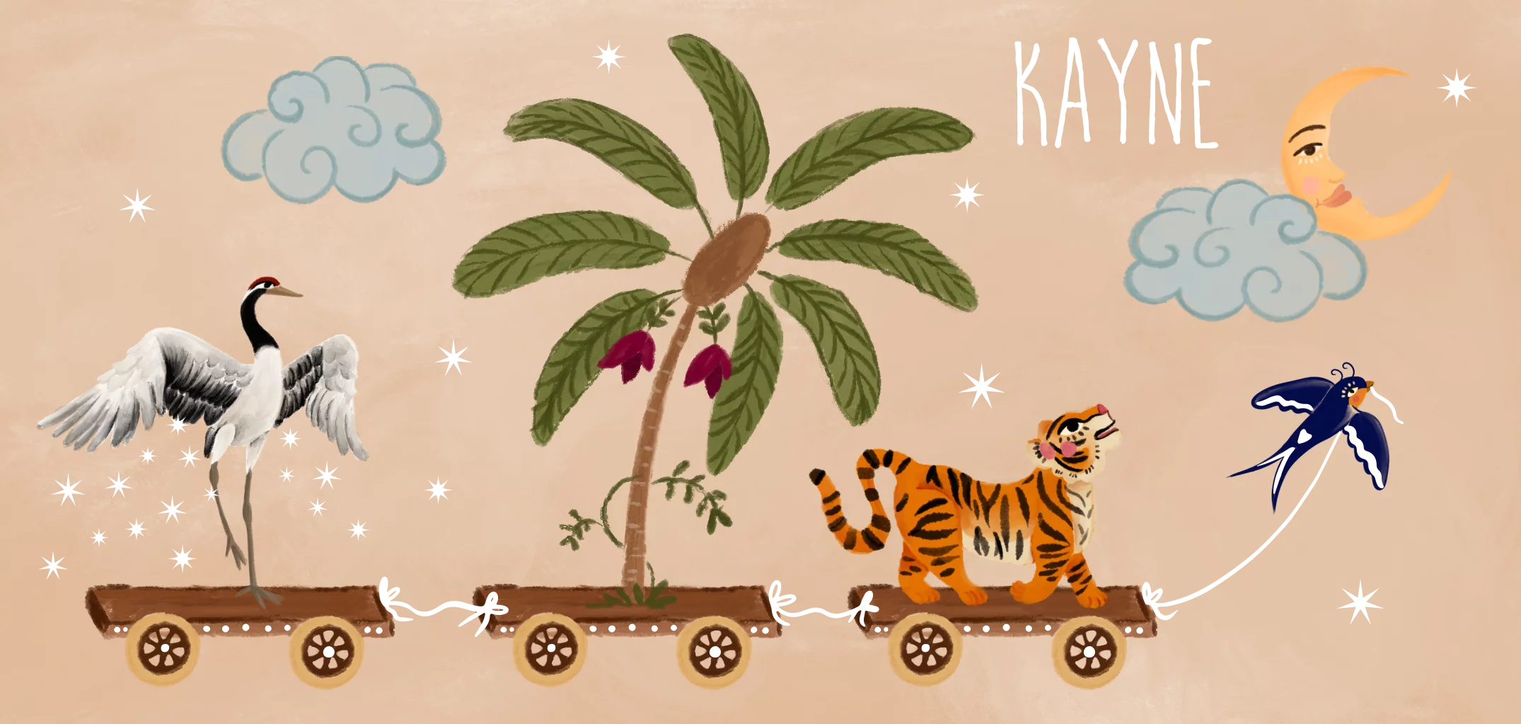 Een nieuwe variant op het fantasie treintje en de circusparade. Een tropisch treintje met een kraanvogel, palmboom, tijger en zwaluw.