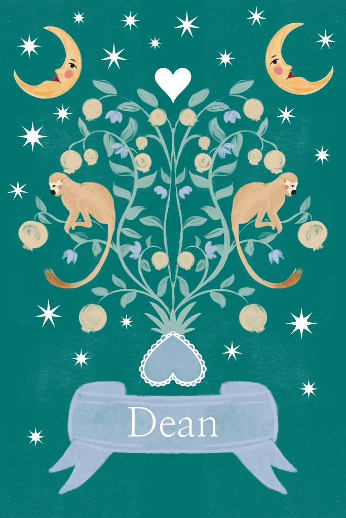 Een symmetrisch geboortekaartje met twee aapjes in een boom. De boom wordt omringd door sterren die je met folie kunt laten afdrukken.