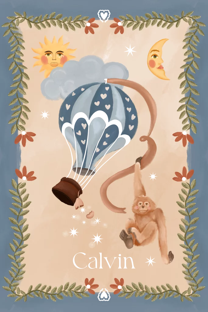 Een schattig aapje hangende aan een luchtballon hoog in de wolken. Een warm blauwe kleur met beige achtergrond.