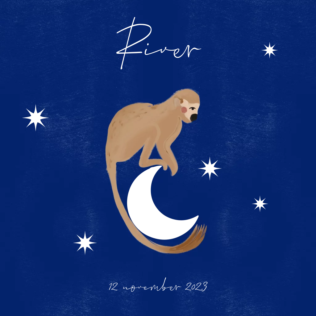 Een minimalistisch geboortekaartje met accenten in folie. De aap zit bovenop de maan.